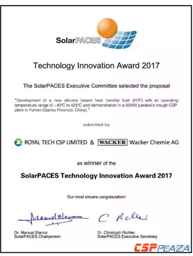 2017年9月29日,在第23屆國際太陽能發電和熱化學峰會(SolarPACES峰會)上,龍騰光熱與德國瓦克化學股份有限公司憑借新型硅油的優異性能及將在商業化項目上的全球首次大規模應用聯手斬獲SolarPACES2017技術創新獎,實現了亞洲光熱企業在此項殊榮上零的突破。