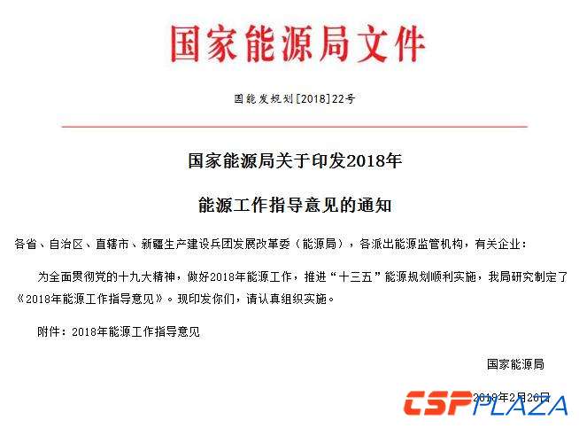 CSPPLAZA光熱發電網訊:3月7日,國家能源局下發關于印發2018能源工作指導意見的通知(簡稱“通知”)。