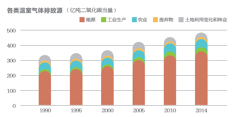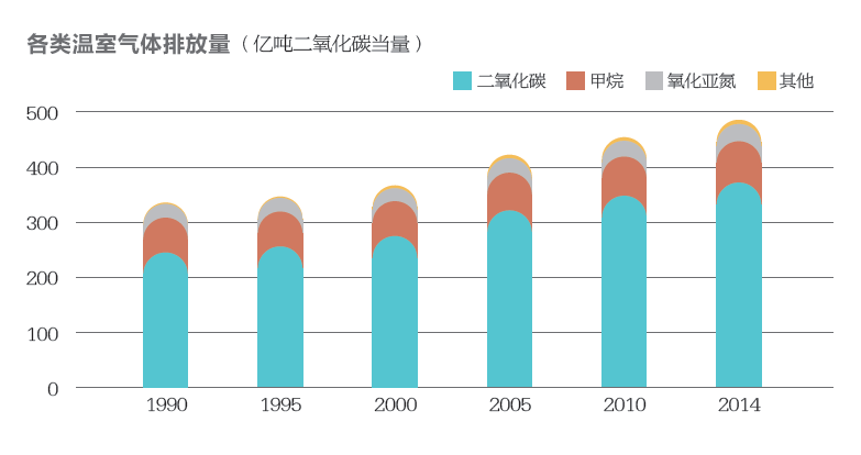 世界資源研究所采集了全球186個國家和地區的數據,統計表明,全球溫室氣體排放總量從1990年的338億噸增長至2014年的489億噸,增長了45%。其中,二氧化碳排放量增長了52%,占溫室氣體排放增量的85%。二氧化碳、甲烷、氧化亞氮以及其他溫室氣體排放量占比分別為77%、15%、6%和2%。