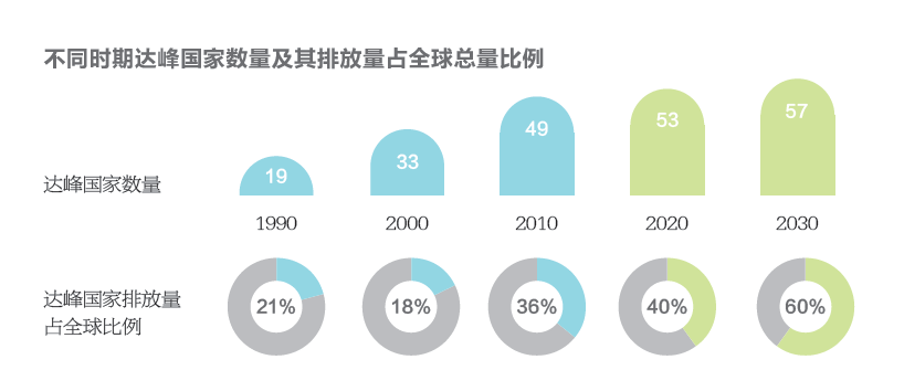 根據各國的減排承諾,到2020年和2030年,達峰國家將分別達到53和57個。按照2010年全球各國排放量占比計算,2020年和2030年達峰國家的排放量將分別占到全球總量的40%和60%。