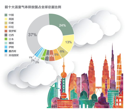 2014年,全球前十大溫室氣體排放國依次是中國(占比24%)、美國(13%)、印度(6%)、印尼(5%)、俄羅斯(4%)、巴西(3%)、日本(3%)、德國(2%)、伊朗(2%)、墨西哥(1%),共占全球總量的63%。