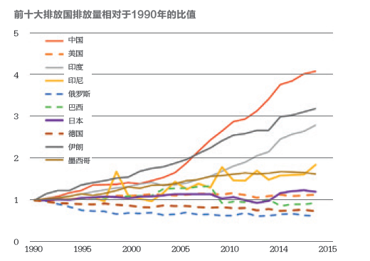 在十大排放國中,美國、俄羅斯、巴西和德國已經實現達峰,除美國外,其余三國的排放量均低于1990年的水平,分別為1990年的63%、94%和74%。