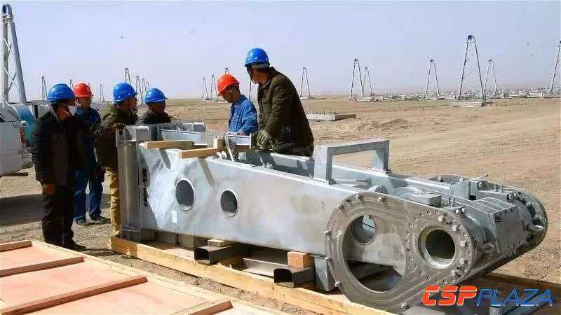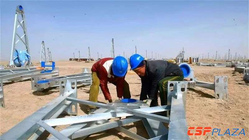 進入春季,阿克塞天氣多變,風沙天氣增多,早晚氣溫溫差大。甘肅光熱發電有限公司的工人們積極發揚“鐵人精神”克服困難,最大程度降低惡劣天氣對施工進度的影響。在施工現場各項工作如火如荼進行著,車間內,工人們正在焊接組裝車間軌道,硬化廠房基礎設施;車間外,銀色的槽式塔架依次排開,工人們正在安裝塔架。