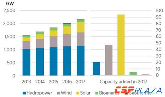 截止2017年年底,全球可再生能源裝機容量累計達到2179GW。其中水電占據最大份額,投產裝機容量1152GW。
