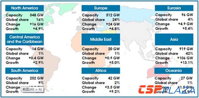 2017年亞洲新增可再生能源裝機容量占據區域內總新裝機容量的64%(2016年為58%),達到919GW,為全球新增再生能源裝機容量的42%。亞洲也是最快的增長區域,同比增長為13.15。歐洲重新獲得新增可再生能源裝機容量擴張的第二位,2017年新增裝機容量為24GW。北美新增裝機容量16GW,與2016年相比增長有所回落。非洲新增可再生能源裝機容量再次出現飛躍式增長,同比增加3.5GW,增幅9.2%。歐亞區域和大洋洲同比增長分別為4.9GW(同比增長5.4%)和1.5GW(同比增長5.9%),而其他地區增速放緩。