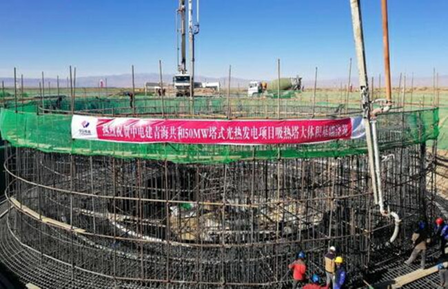 CSPPLAZA光熱發電網訊:據上海電力建筑工程有限公司方面消息,日前,由其承建的中電建青海共和50MW塔式光熱發電項目吸熱塔工程大體積基礎澆筑完成。