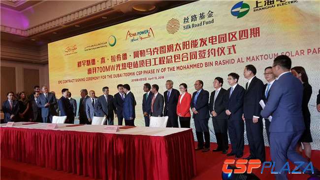 CSPPLAZA光熱發電網訊:4月13日(今日),全球最大的太陽能光熱發電項目——阿聯酋迪拜Mohammedbin Rashid Al Maktoum太陽能園區第四期700MW光熱發電站的總包合同在上海正式簽約,上海市市委常委、常務副市長周波、迪拜水電局董事長賽義德?穆罕默德?阿爾塔耶爾、沙特阿拉伯王國駐華大使圖爾基?艾勒馬迪、阿拉伯聯合酋長國駐華大使阿里?扎希里、沙特國際電力和水務公司董事主席穆罕默德?阿布拿楊、阿拉伯聯合酋長國駐滬總領事拉世德?卡姆茲、絲路基金董事長王燕之、上海市發展和改革委員會副主任周強等相關單位代表出席了此次簽約儀式。