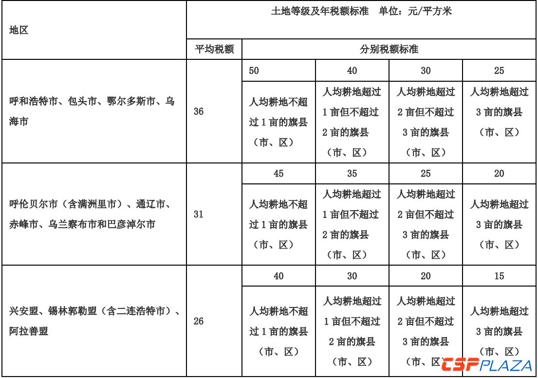 表七:內蒙古耕地占用稅每平方米平均稅額按照下列規定執行: