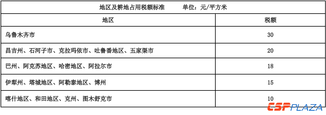 表六:新疆地區州、市(地)耕地占用稅每平方米平均稅額按照下列規定執行: