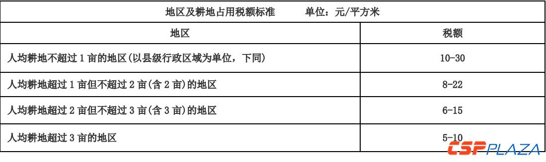 耕地占用稅由地方財政局負責,一次性繳納,計入項目初始投資。下面幾張表列出了首批示范項目各地區的耕地占用稅征稅標準。