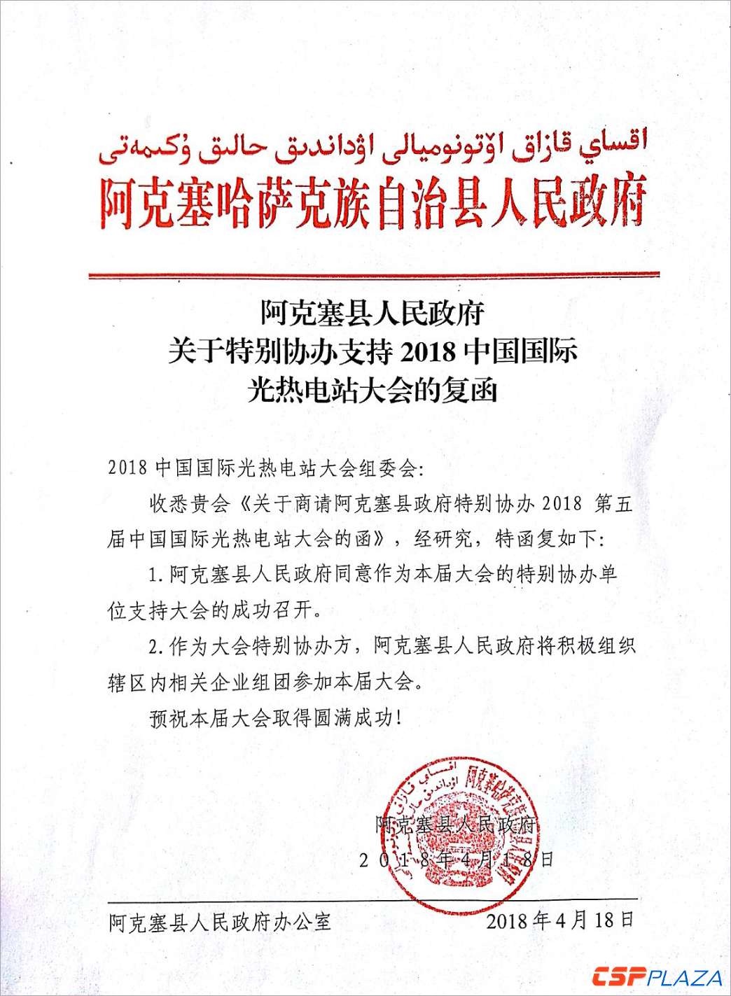 CSPPLAZA光熱發電網訊:4月19日,光熱重鎮阿克塞縣人民政府函復2018中國國際光熱電站大會組委會,稱將作為本屆大會的特別協辦單位支持大會的成功召開。作為大會特別協辦方,阿克塞縣人民政府將積極組織轄區內相關企業組團參加本屆大會。