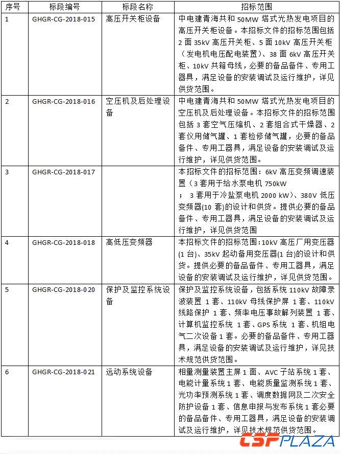 根據公告,本項目此次招標范圍為中電建青海共和50MW塔式光熱發電項目第二批輔機設備,由中標人承包提供本招標公告中所規定的設備,包括設備項目的設計、制造、出廠前的試驗、包裝、運輸、現場交接;提供安裝和調試指導、現場技術培訓;指導現場試驗和驗收;負責產品資料文件編制和提交等,具體情況詳見以下招標范圍信息表: