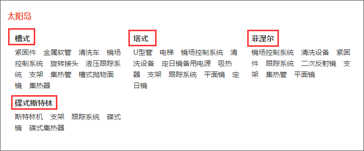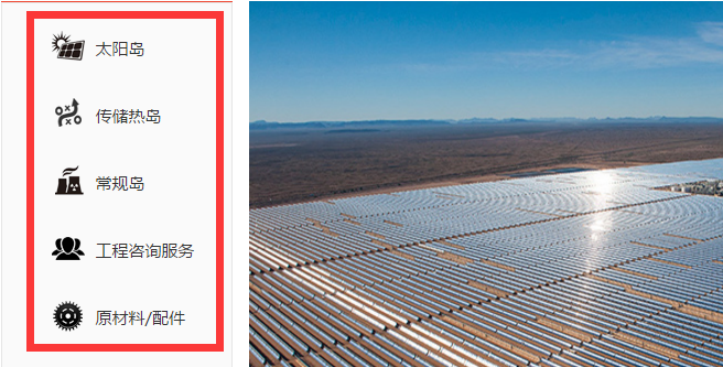 該平臺把光熱發電產業涉及的相關產業鏈分為五大類:太陽島、傳儲熱島、常規島、工程咨詢服務以及原材料/配件。