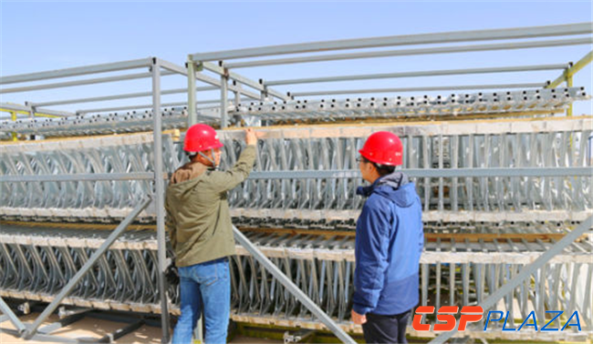 圖:甘肅光熱發電有限公司工程技術人員正在檢查剛剛到貨的集熱支架