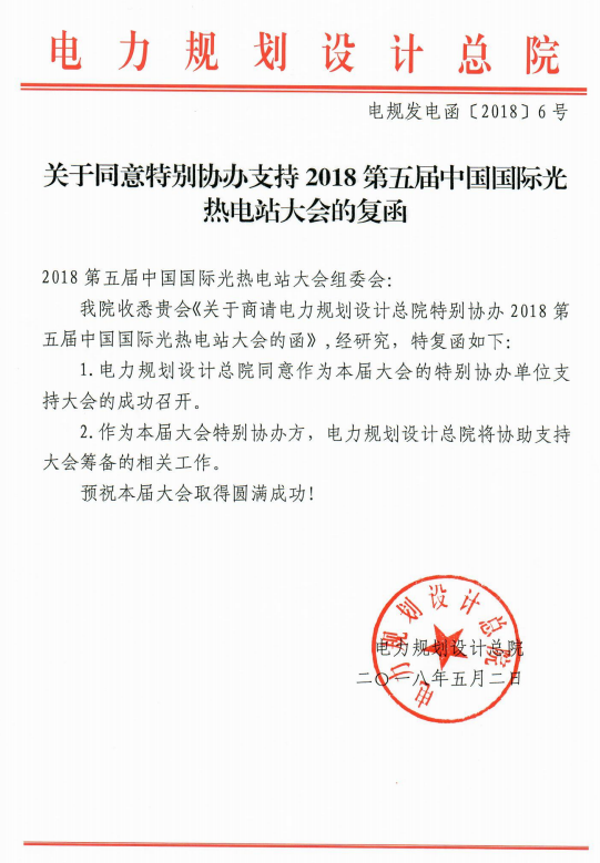 CSPPLAZA光熱發電網訊:5月2日,電力規劃設計總院(簡稱“電規總院”)函復2018中國國際光熱電站大會組委會,將作為本屆大會的特別協辦單位全力支持大會的成功召開。作為大會特別協辦方,電規總院將協助支持大會籌備的相關工作。