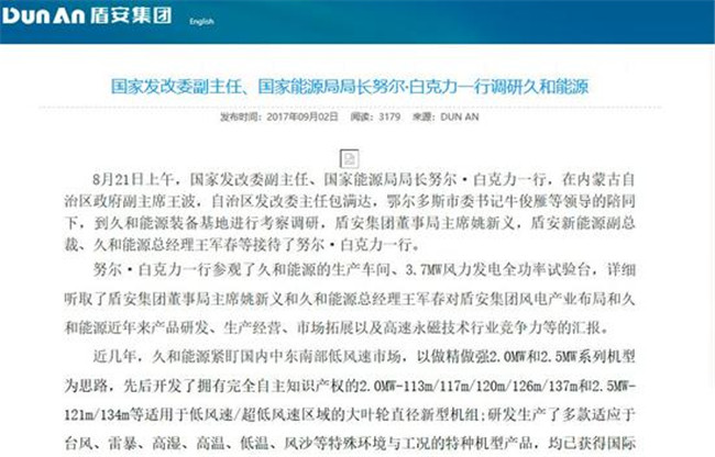 2017年09月02日,盾安在官網發布信息,8月21日上午,國家發改委副主任、國家能源局局長努爾·白克力一行,在內蒙古自治區政府副主席王波,自治區發改委主任包滿達,鄂爾多斯市委書記牛俊雁等領導的陪同下,到久和能源裝備基地進行考察調研,盾安集團董事局主席姚新義,盾安新能源副總裁、久和能源總經理王軍春等接待了努爾·白克力一行。