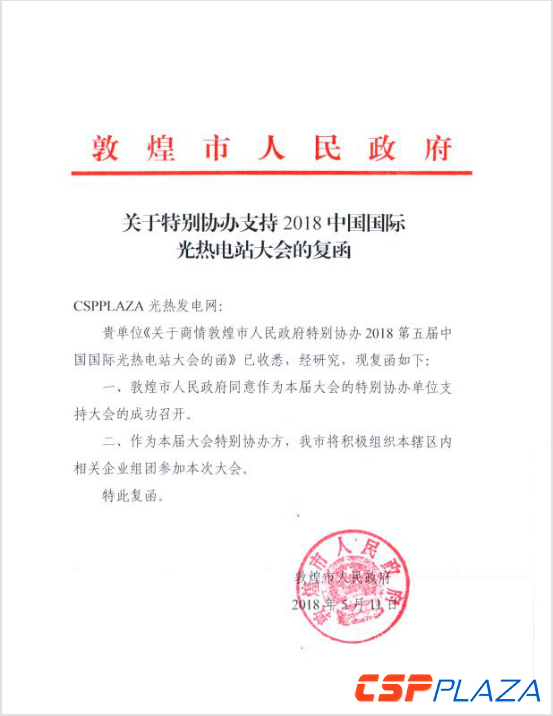 CSPPLAZA光熱發電網訊:5月11日,甘肅省敦煌市人民政府函復2018中國國際光熱電站大會組委會,確認將作為本屆大會的特別協辦單位全力支持大會的成功召開。作為大會特別協辦方,敦煌市人民政府將積極組織有關領導和轄區內相關企業組團參加本屆大會。