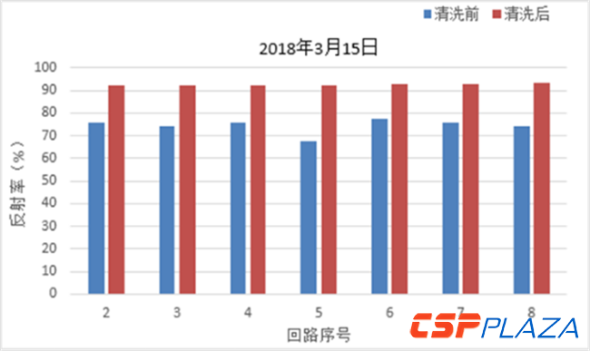 清掃及反射率測試數據統計充分反映出,中國氣候環境中鏡面清掃對光熱電站的極度重要性,可靠而經濟的高頻次清掃質量事關電站的投資成敗,值得業內高度關注。