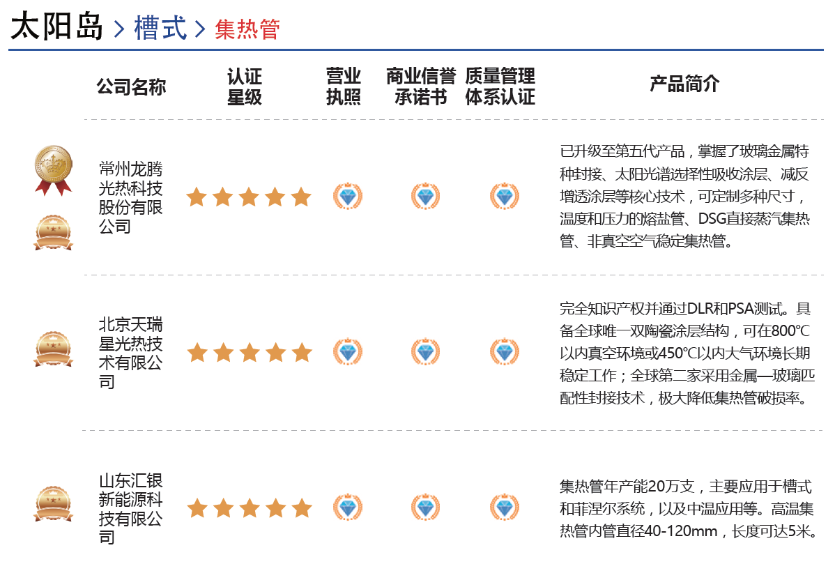 上述信息將分太陽島、傳儲熱島、常規島、工程咨詢服務和原材料/配件五大類錄入,并附有供應商發布的簡化版產品信息,您可迅速對比同類產品或服務的相關供應商,篩選出意向合作方。同時,指南中還將插入近100家業內企業的品牌展示彩頁。