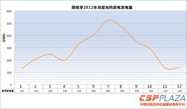 其中在2012年7月份,光熱發電創下單月發電記錄,達到534GWh,占當月總發電量的2.31%。