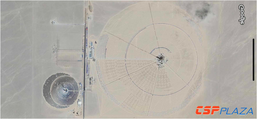 這是敦煌光熱電站谷歌地圖俯視圖,左側是試驗裝置—1萬千瓦的電站,右側是在建的10萬千瓦電站。