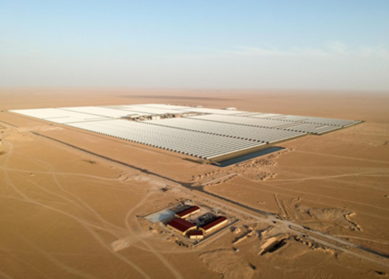 該項目占地面積約為247公頃,區域地面平整,約有100萬方的場平工作,采用SKAL-ET槽,集熱面積達673,620平方米,總計206個回路,安裝275000面反射鏡,10000支集熱管,20000噸金屬結構、3000噸導熱油、33000噸熔鹽。