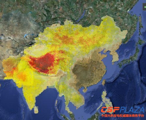 在此地圖上,可以在線查閱全球的太陽能DNI分布情況,了解全球適合開發光熱電站的具體區域。網址鏈接為:http://irena.masdar.ac.ae。上圖即為該地圖中所呈現的中國地區的DNI輻照數據圖像。