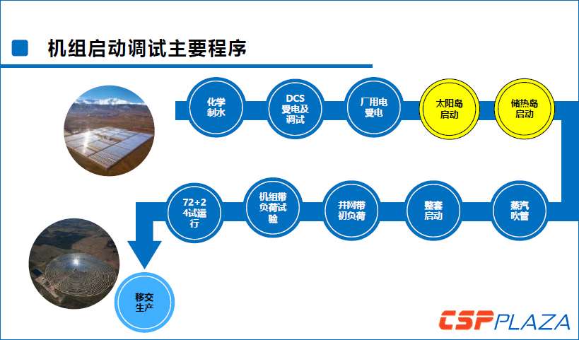 光熱的調試主要的內容包括前期準備、分系統調試、空負荷、滿負荷實驗,機組72+24小時運行。在參與中廣核德令哈項目調試運維投標時,業主希望以安全168小時運行規程進行考核。蔡虎認為以中國現在光熱電站光照的自然條件以及系統的穩定性來看,能否達到168小時是需要討論的,推薦做72+24。達到滿負荷實驗,可以是72+24或者是168,如果可以達到也可以在此狀況下進行機組運行考核,目的是為了確認機組各項性能指標達到優秀的程度,機組是否具備可靠穩定的生產能力。