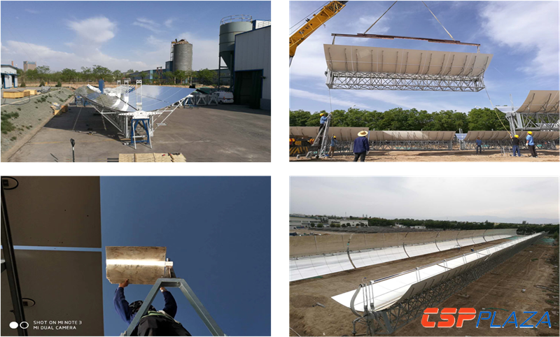 項目照片,剛開始在這片空地上進行檢驗的照片,高位槽。這是鏡場建設期的照片,第一個集熱器組裝下線的情況,吊裝過程中的照片,相當于集熱回路剛完成建設的情況,項目建設完成時調試跟蹤照片。18號剛實現產氣。