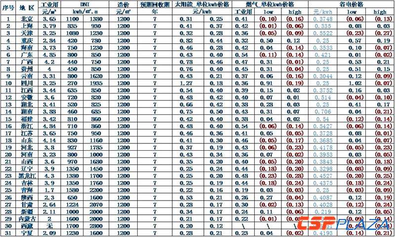 之前說過煤、電和天然氣單位千瓦時熱價,太陽能也可以折算一下熱價,從系統造價包括運行部分費用,還有DNI、年化效率以及預期回收期,我們可以大致折算出聚光太陽能單位千瓦時熱價,只要熱價比現在的傳統能源有優勢,就有推廣的條件。