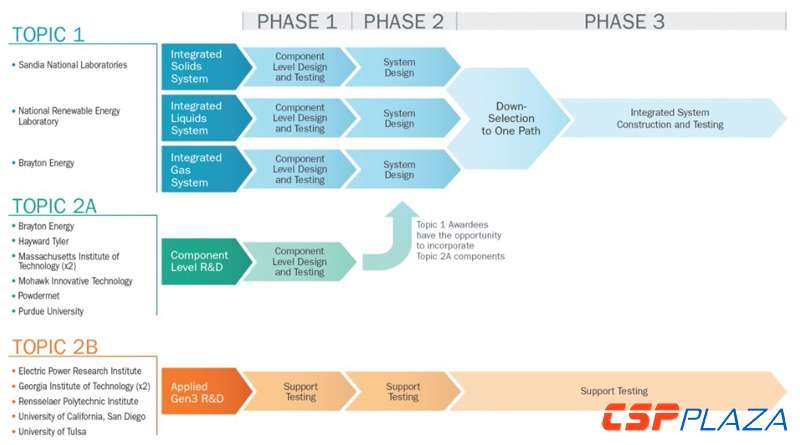 目前,能源部已經選定了布雷頓能源公司(Brayton Energy)、美國國家可再生能源實驗室(NREL)以及桑迪亞國家實驗室(Sandia Laboratories)三家研究機構參與該項目,他們就一項投入達2500萬美金的高溫集成系統示范項目展開競爭。三家機構將分別就700℃以上的氣體、流體和固體傳熱系統進行組件級別的設計和測試,然后選擇一種方案進行實施。根據規劃,該項目將于2020年中期投運,運行至2023年左右。