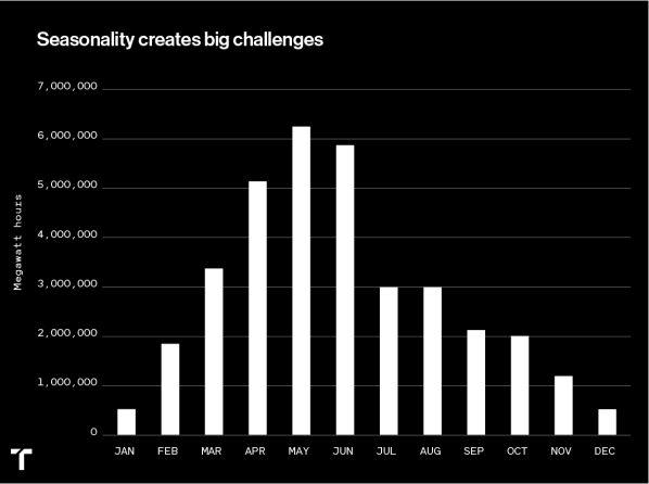 這個問題在加利福尼亞尤其嚴重,在秋季和冬季,風能和太陽能都會急劇下降。這是季節性模式的樣子: