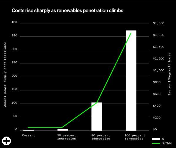 建立達到該州目標所需的可再生能源發電和儲存水平將成倍地推高成本,從50%的每兆瓦時49美元增加到100%的1,612美元。