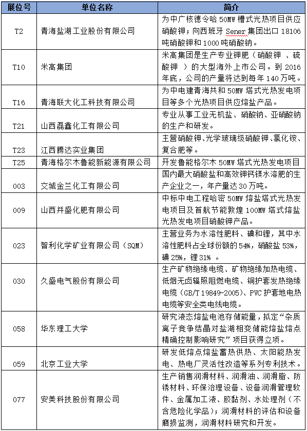 截至8月2日,已有近70家展商確定在本屆大會中進行展示,參展主體覆蓋地方政府、科研院所、高校機構及國內外鉀鹽、熔鹽、鎂、鋰鹽、中微量元素等原材料供應商,此外還有熔鹽設備、熔鹽儲熱供熱系統集成商、光熱項目開發商、鋰電池生產商等也將攜技術解決方案參與此次展會。(詳見附表)