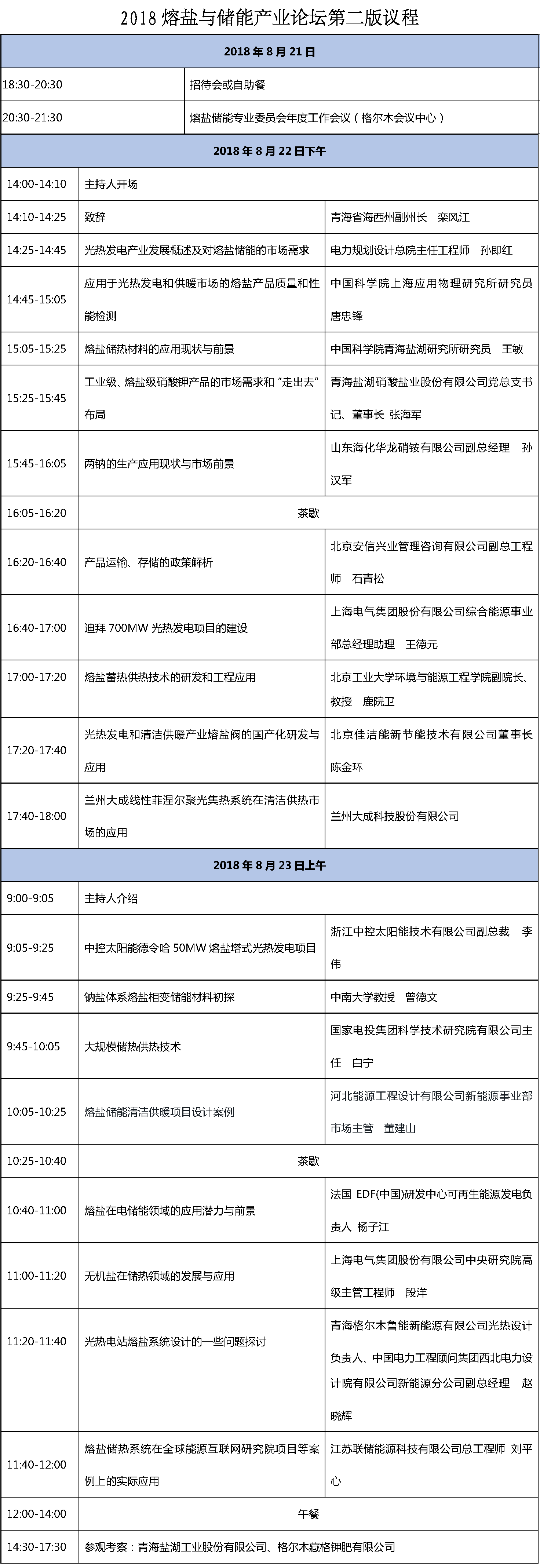 CSPPLAZA光熱發電網訊:2018熔鹽與儲能產業論壇將于8月21日-23日在青海省格爾木市召開,本屆論壇由中國無機鹽工業協會熔鹽儲能專業委員會與CSPPLAZA光熱發電網聯合舉辦。今日,本屆論壇第二版議程正式發布(詳見附表),共有20余位來自熔鹽、光熱發電及清潔供暖行業的嘉賓同與會人員進行經驗交流與分享。