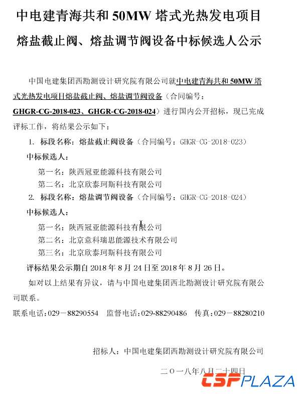 CSPPLAZA光熱發電網訊:8月24日,中電建青海共和50MW塔式光熱發電項目發布熔鹽截止閥、熔鹽調節閥設備中標候選人公示。評標結果公示期自2018年8月24日至2018年8月26日。據公告,該項目熔鹽截止閥設備中標候選人第一名為陜西冠亞能源科技有限公司,熔鹽調節閥設備中標候選人第一名同為陜西冠亞能源科技有限公司。
