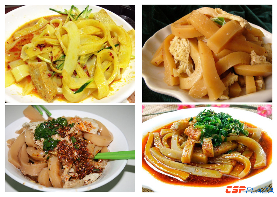 釀皮是青海地方風味較濃的傳統小吃,在麥面中摻和一定數量的蓬灰和敷料,用溫水調成硬面團,再幾經揉搓,等面團精細光滑后,再放入涼水中連續搓洗,洗出淀粉,面團成為蜂窩狀物時,放進蒸籠蒸熟,這叫“面筋”,再將沉淀了淀粉糊舀在蒸盤中蒸熟,這便叫“蒸釀皮”。蒸熟了釀皮,從盤中剝離,切成長條,配上面筋,澆上醋、辣油、芥茉、韭菜、蒜泥等佐料,吃起來辛辣、涼爽、口感柔韌細膩,回味悠長。
