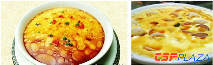 青海高原盛產的發菜是山珍之一,在封建社會作為供奉皇室的一宗貢品,唐、宋時已遠銷國外。青海人以發菜作主料烹調的發菜蒸蛋,有人雅稱“黃金白銀烏絲糕”,做法是雞蛋黃白分離,攪打勻稱,并調精鹽、姜粉、花椒等粉末佐料,以蛋白襯底,上覆蓋洗凈的發菜,先上籠蒸到發菜和蛋白凝結,固定成形后,在上層傾入攪勻的蛋黃繼續蒸到熟透,在蒸碗中用刀劃成方形或菱形,反扣湯盤中心,上澆羊肉湯(牛肉湯、雞湯均可),湯汁中放木耳、黃花、筍片、香菜末等,最后撒幾滴香油上桌。