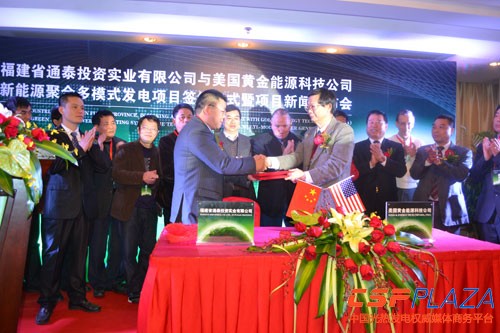 1月23日上午,福建省通泰投資實業有限公司與美國黃金能源科技公司新能源多模式發電項目簽約儀式暨新聞發布會在福州舉行。此項目第一次引進了美國專利新能源聚合多模式發電技術,將落地福建長樂金峰。