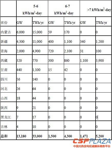 CSPPLAZA光熱發電網報道:美國能源基金會中國可持續發展能源項目提供的相關報告指出,以美國NREL根據天氣日輻照模型提供的分辨率為40km×40km的DNI數據為基礎,考慮了云遮蓋、水汽、氣溶膠、和痕量氣體等因素,對中國太陽能熱發電可開發利用潛能進行計算,中國太陽能熱發電潛能約16000GW。