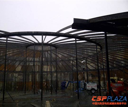 靠近集熱塔的是儲熱系統,該項目將配置10小時儲熱,儲熱罐的建設工作已經完成過半,圖2顯示的是工人正在罐中工作,對罐體進行加固。