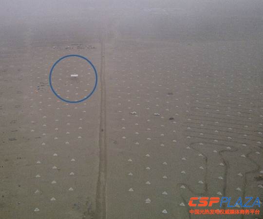站在集熱塔上向下俯視,可以看到無數的白色小三角在沙漠中延伸,這些白色的小三角為定日鏡混凝土基座,藍圈內的為安裝完成的一個定日鏡系統,從遠處看,顯得十分渺小。