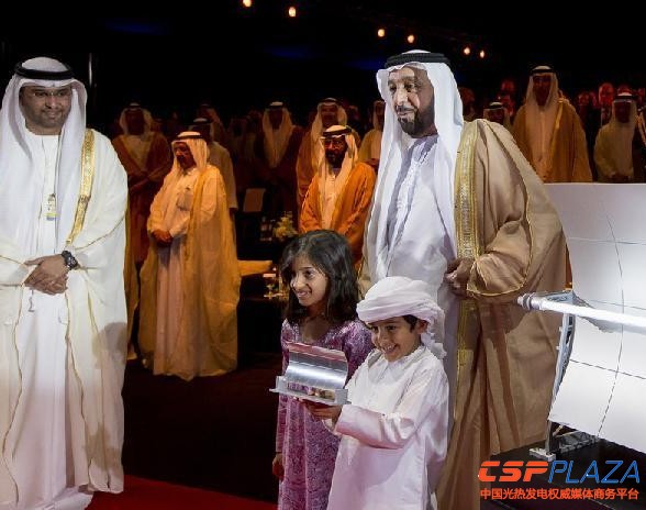 圖:阿聯酋總統謝赫哈利法·本·扎耶德·阿勒納哈揚(前排右一)將一個槽式反射鏡系統模型交給兩名兒童,宣告電站落成并網發電。