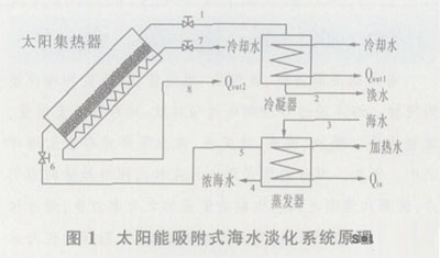 在該裝置中,裝有吸附材料的吸附床可直接吸收太陽光,太陽能集熱器既是發生器(對應于脫附過程),又是吸附器(對應于吸附蒸汽過程)。吸附過程和脫附過程是交替進行的。夜間,利用白天被太陽能加熱的水給蒸發器加熱,蒸發器內的海水受熱蒸發,蒸汽進入太陽能集熱器