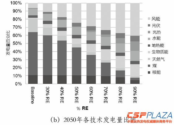 考慮未來可再生能源發展不確定性,即可能受到政策、市場、技術等方面影響,為此《前景研究》設計了一系列探索性情景,著重考慮2050年可再生能源發電量不同比重(30%~90%,增量為10個百分點)對電源結構、輸電設施及電網靈活性等方面影響,至于技術進步方面,假設出現了小規模技術進步。