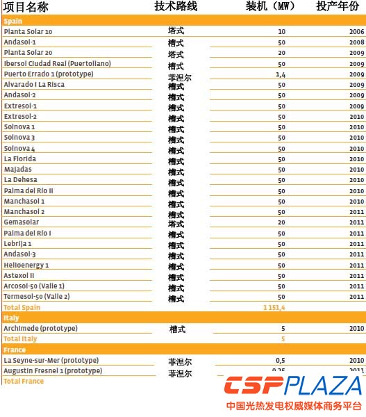圖:歐洲CSP項目統計表(總裝機1157,2MW)
