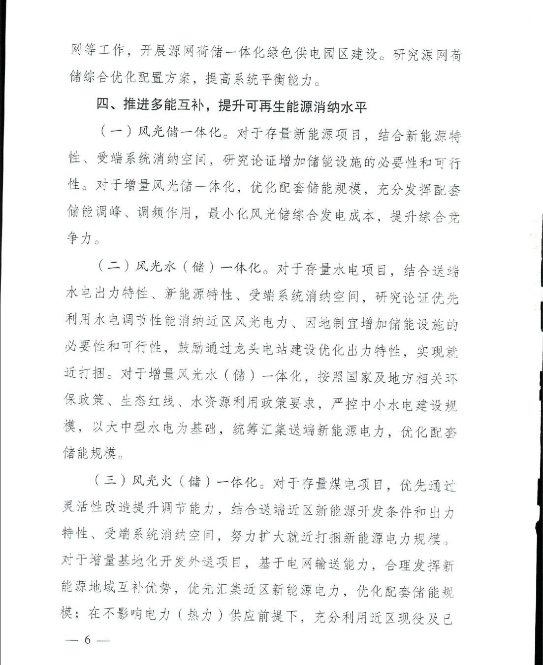 風光火(儲)一體化。對于存量煤電項目,優先通過靈活性改造提升調節能力,結合送端近區新能源開發條件和出力特性、受端系統消納空間,努力擴大就近打捆新能源電力規模。對于增量基地化開發外送項目,基于電網輸送能力,合理發揮新能源地域互補優勢,優先匯集近區新能源電力,優化配套儲能規模;在不影響電力(熱力)供應前提下,充分利用近區現役及已納入國家電力發展規劃煤電項目,嚴控新增煤電需求;外送輸電通道可再生能源電量比例原則上不低于50%,優先規劃建設比例更高的通道;落實國家及地方相關環保政策、生態紅線、水資源利用等政策要求,按規定取得規劃環評和規劃水資源論證審查意見。對于增量就地開發消納項目,在充分評估當地資源條件和消納能力的基礎上,優先利用新能源電力。