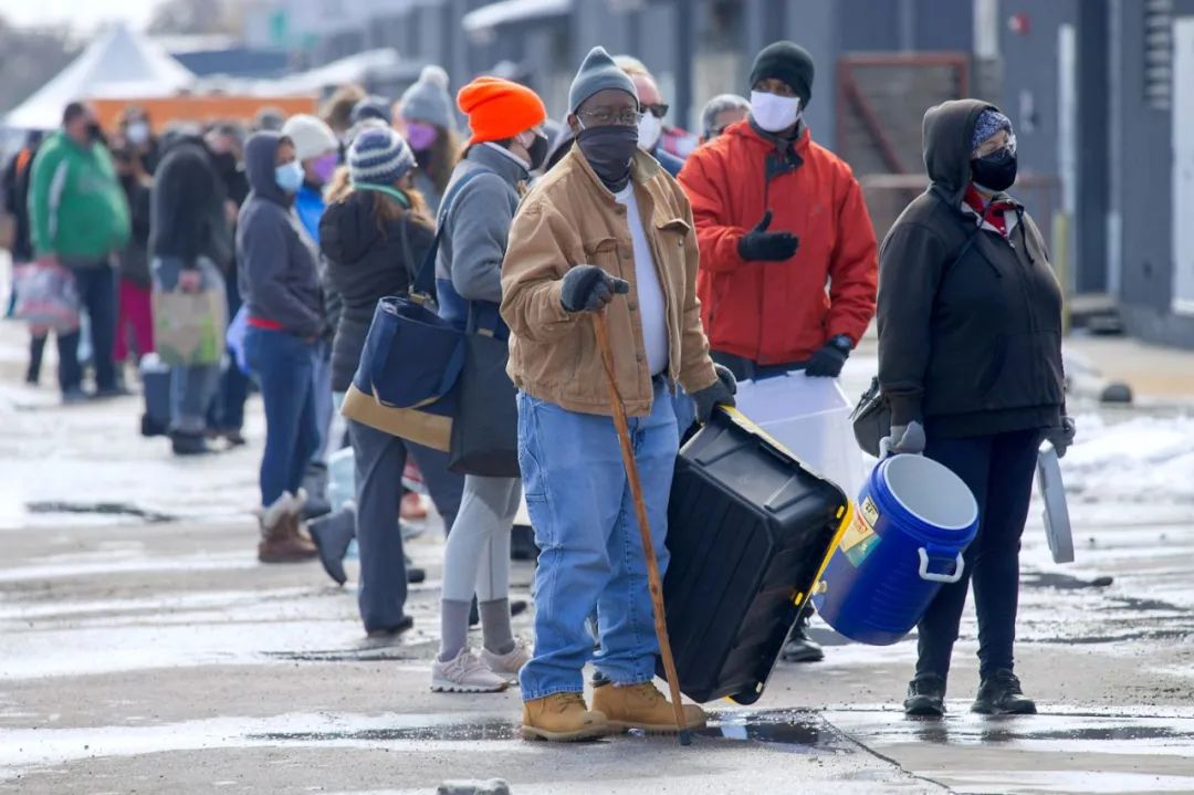 極寒天氣導致得州多處停水斷電,當地居民排隊領取飲用水。圖片來源:Mario Cantu/CSM/Sipa USA