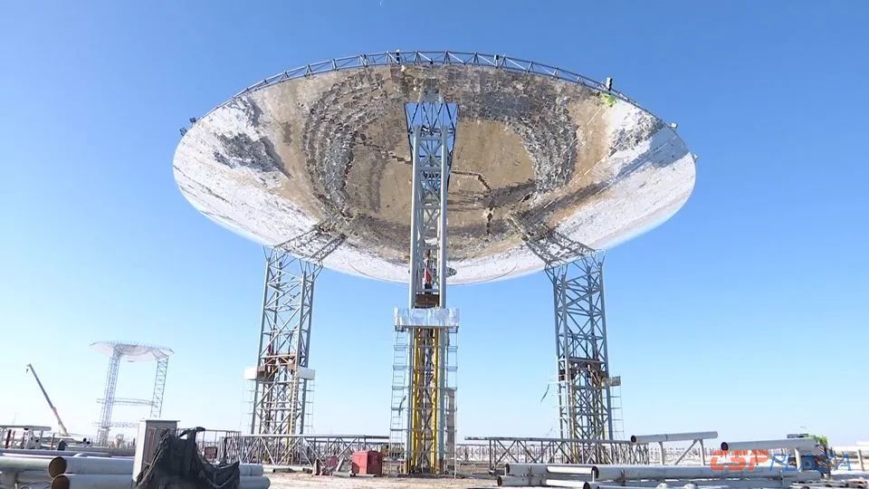 截至目前,該項目汽輪發電機組、蒸汽發生系統等設備已全部安裝完成,中央冷、熱熔鹽罐具備交付條件,110千伏送出線路已完成,計劃今年11月并網發電。