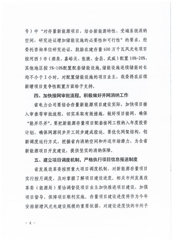 值得注意的是,《通知》還提出,鼓勵配置儲能設施。鼓勵在建存量600萬千瓦風光電項目按河西5市(酒泉、嘉峪關、張掖、金昌、武威)配置10%-20%、其他地區按5%-10%配置配套儲能設施,儲能設施連續儲能時長均不小于2小時。對配置儲能設施的項目業主,甘肅省發改委將在后續新增項目競爭性配置方面給予支持。